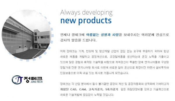 정테크 주소 : 울산 울주군 온산읍 처용산업2길86 대표이사 정문호 TEL: 052-289-6078 FAX: 052-289-6077 홈페이지: http://www.jeongtech.com/html/00_main/main.php