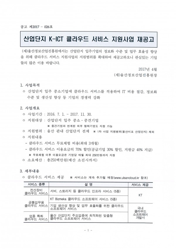 울산 K-ICT 클라우드 서비스 지원사업 재공고 안내 |