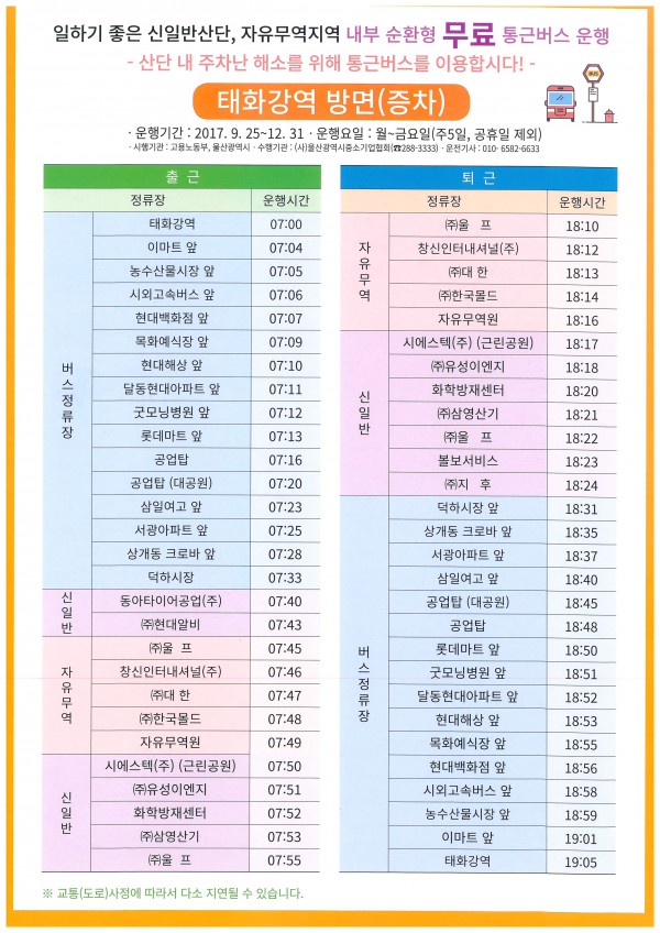 신일반산단,자유무역지역 내부 순환형 무료 통근버스 운행 안내(태화강역 방면 증차)