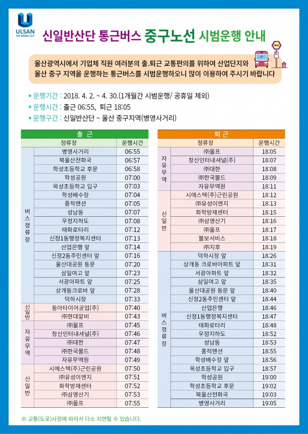 신일반산단버스 통근버스 중구노선 시범운행 안내(4.2~4.30/1개월간 시범운행)