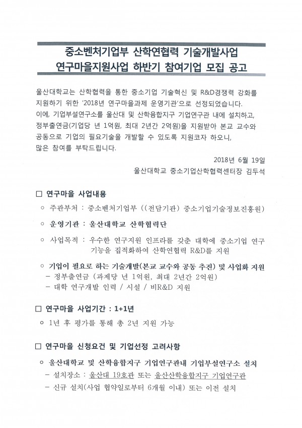 울산대학교 2018년 연구마을과제 운영기관 선정 정부출연금 지원 안내