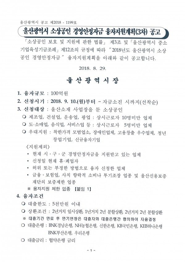 2018년 울산광역시 소상공인 경영안정자금 융자지원계획(3차) 안내 |