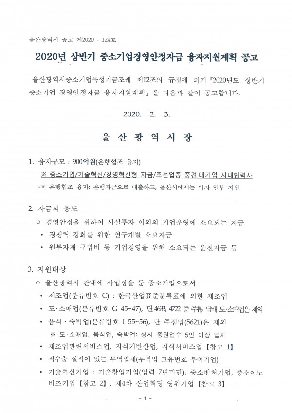 2020년 상반기 중소기업경영안정자금 융자지원계획 안내 |