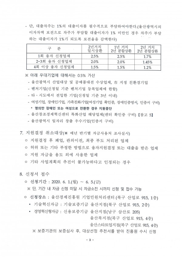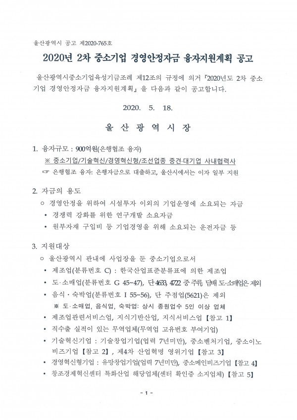 울산시에서는 아래와 같이 중소기업 경영안정자금 융자지원 한다고합니다. 신청접수 기간: 2020.6.1(월)~ 6.5(금) 상세내용은 아래 내용을 참고하시고 첨부파일의 서식을 활용하시기 바랍니다. |
