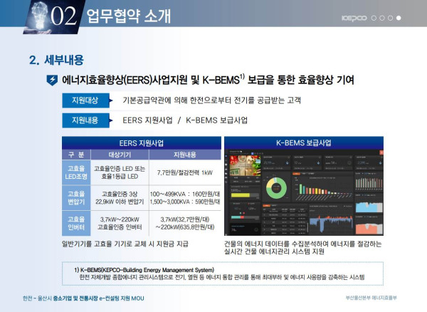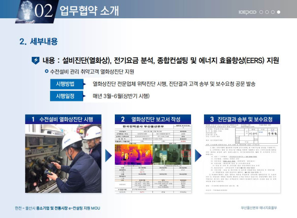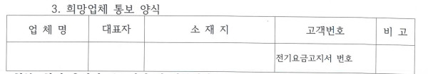 1.대상업체 :고압고객 중소기업(설비 노후 정도에 따라 컨설팅 우선순위 부여) 2.점검내용:수전설비,열화상진단,전기요금 분석,종합컨설팅 및 에너지효율 향상지원(문의 :한국전력부산울산본부 에너지효율부051-604-5463,5458) 3.희망업체 통보양식(아래4가지사항기입) 업체명: 대표자: 소재지: 전기요금고지서번호:
