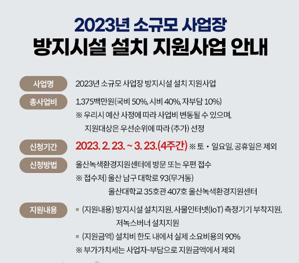 1. 사 업 명 : 2023년 소규모 사업장 방지시설 설치 지원사업 2. 총사업비 : 1,375백만원(국비 50%, 시비 40%, 자부담 10%) ※ 우리시 예산 사정에 따라 사업비 변동될 수 있으며, 지원대상은 우선순위에 따라 추가 선정 3. 신청기간 : 2023. 2. 23. ~ 3. 23.(4주간) ※ 토·일요일, 공휴일은 제외 4. 신청방법 : 울산녹색환경지원센터에 방문 또는 우편 접수 ※ 접수처) 울산 남구 대학로 93(무거동) 울산대학교 35호관 407호 울산녹색환경지원센터 5. 지원내용 □ (지원내용) 방지시설 설치지원, 사물인터넷(IoT) 측정기기 부착지원, 저녹스버너 설치지원 □ (지원금액) 설치비 한도 내에서 실제 소요비용의 90% (※ 부가가치세는 사업자 부담으로 지원금액에서 제외)