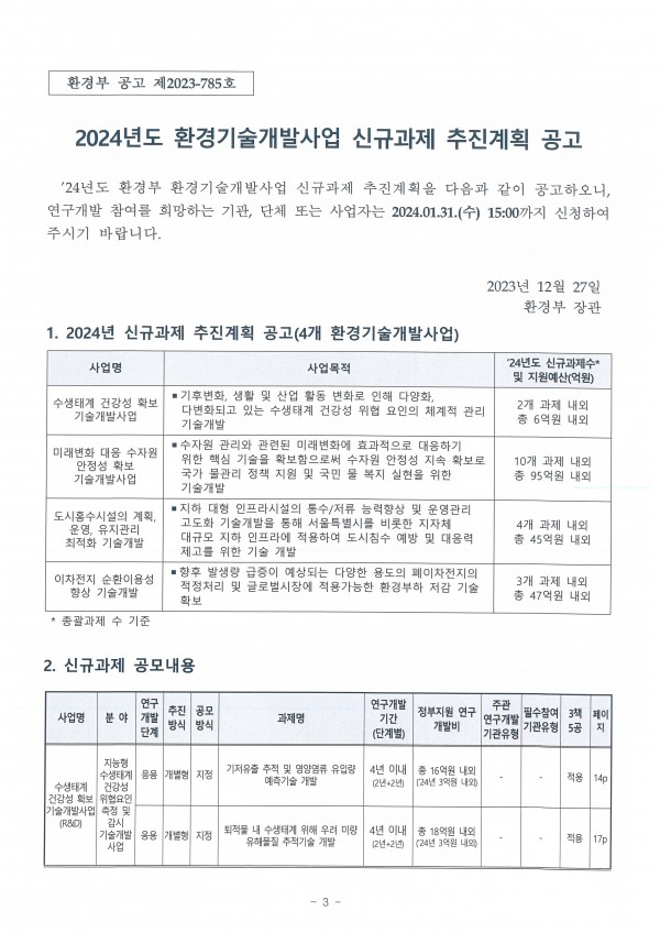 ************내용이 방대하여 반드시 첨부파일[2024년도 환경기술개발사업 신규과제 추진계획 공고zip]파일을 확인 하시기 바랍니다****************** ************참여 희망하는 단체 및 기관은 또는 사업자는 2024.1.31(수) 15시까지 신청하여 달라고 합니다.************************
