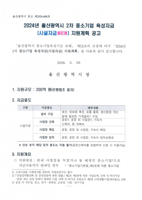 2024년 울산광역시 2차 중소기업 육성자금[시설자금]지원계획 공고 |