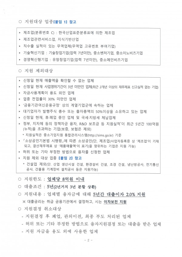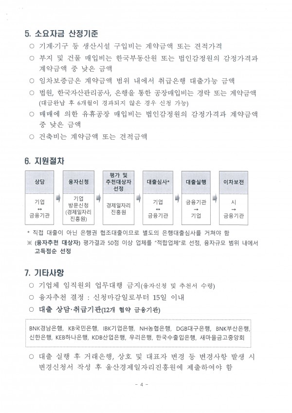 1. 지원규모 : 200억 원[은행협조 융자] 2. 지원한도 : 업체당 8억원 이내 3. 신청서 접수 :2024.4.15(월)~4.19(금) 4. 접수처: 울산경제일자리진흥원 기업종합지원센터(울산 북구 산업로915,1층) 5. 문의처:울산경제일자리진흥원(052-283-7221) *신청,구비서류 및 지원제외 대상 등 자세한 내용은 지원공고고문 및 신청서식을 참고하여주시기 바랍니다. |