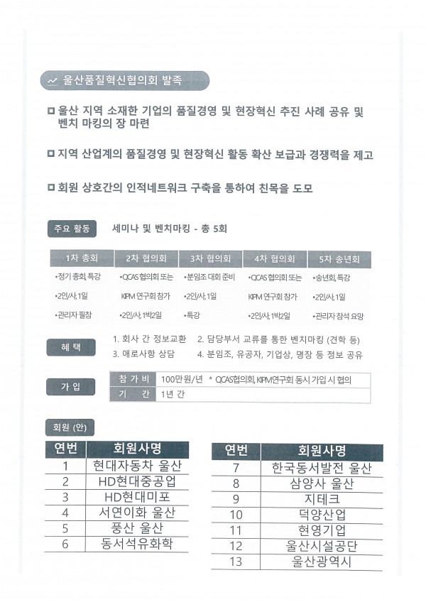 일 시 : 2024년 6월 13일 목요일 13시~17시 장 소 : 한국표준협회 울산지역본부 5층 강의장(울산경제일자리진흥원 5층) 비 용 : 무 료 내 용 : DX 시대 속 품질경영"Q 4.0" HD현대중공업 1차 협력사 모기업 및 2차 협력사 대응 전략 조립산업 품질진단 및 이슈도출 울산품질혁신협의회 발족 및 1차 모임 |
