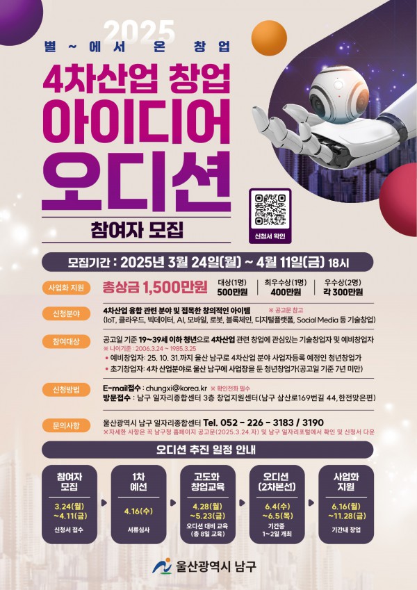 ❍ 공고 및 접수기간 : 2025. 3. 24.(월) ~ 4. 11.(금) 18시 ❍ 1차 예선 및 고도화 창업교육 : 2025. 4. 16.(수) ~ 5. 23.(금) ❍ 4차산업 창업아이디어 오디션 개최 : 6. 4.(수) ~ 6. 5(목) [기간 중 1~2일] ❍ 참여대상 : 공고일 기준 19~39세 이하 청년으로 4차산업 관련 창업에 관심 있는 기술창업자 및 예비창업자 ※ 나이기준: 2006. 3. 24. ~ 1985. 3. 25. ❍ 주요내용 - (1차 예선) 서류심사를 통한 2차 본선진출자 선정 - (2차 교육) 1차 예선 통과자 오디션 대비 고도화 창업교육 - (2차 본선) 4차산업 창업아이디어 오디션 개최 및 우수창업가 선정 ※ 대상: 1명 5,000천원, 최우수상: 1명 4,000천원, 우수상: 2명 3,000천원 ※ 우수창업가 선정자 수는 심사 결과에 따라 적거나 없을 수 있음.