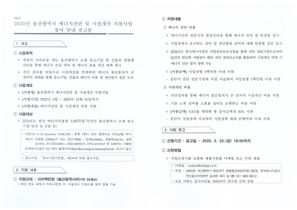 2025년울산광역시 에너지진단 시설 개선지원사업(2,000TOE미만사업장대상) |
