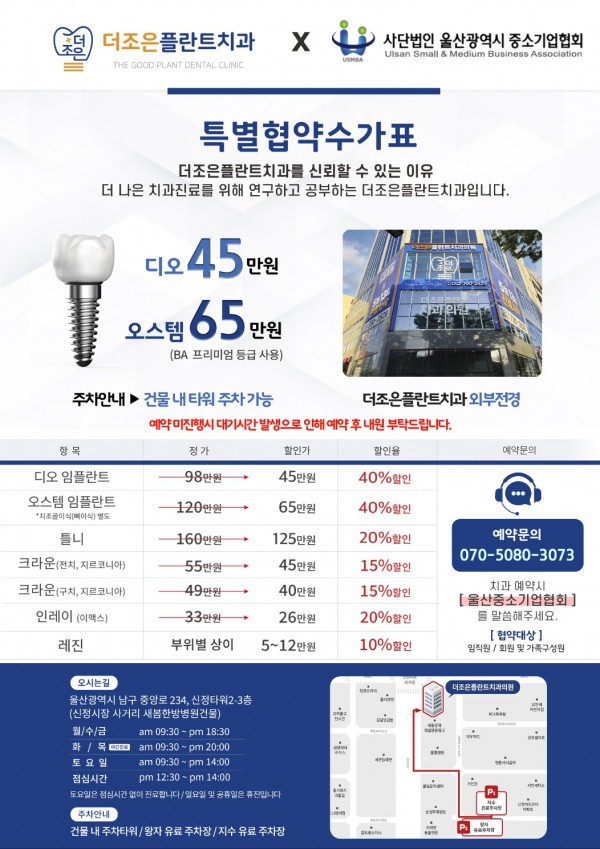 [울산더조은플란트치과] 울산더조은플란트치과는 신정시장 앞, 2층과 3층에 걸쳐 위치한 대형 규모의 치과이며 최신 장비와 쾌적한 시설, 4명의 원장님, 그리고 30여 명의 직원들이 함께 정성 어린 진료를 제공하고 있습니다. 이번에 울산중소기업협회와 협약을 맺고 특별한 진료 혜택을 준비하였다합니다. 중소기업협회 회원사 임직원분들은 누구나 아래와 같은 혜택을 받을 수 있습니다. 울산더조은플란트치과 상담문의 : 070-5080-3073 |