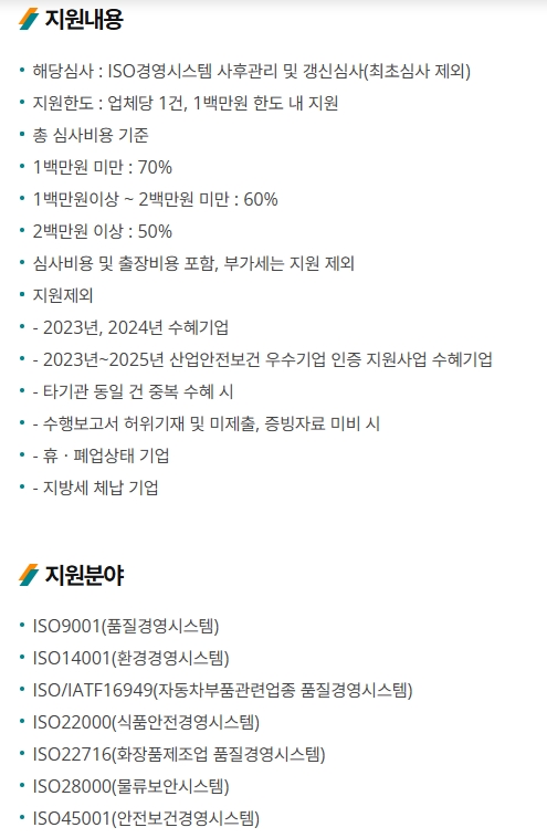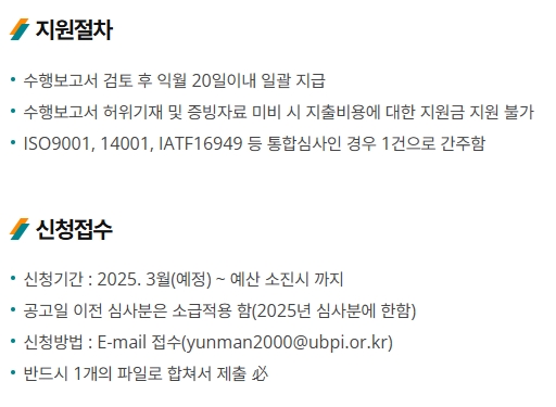 ❍ 대 상 : 울산광역시에 본점과 사업장을 둔 중소기업 ❍ 사업기간 : 2025. 3월 ~ 12월 ❍ 지원규모 : 62개사 내외 ❍ 지원내용 : 갱신 및 사후관리 비용 50~70%이내, 1백만원 한도 ❍ 지원분야 : ISO9001 등 7개 분야 ❍ 시행방법 : 상·하반기 분리시행 ※ 상반기 잔액 발생 시, 하반기 이월 집행 예정 ❍ 신청기간 : 2025. 7. 1.(화) ~ 12. 13.(토) ※ 예산 소진 시까지 선착순 지원 ❍ 신청방법 : E-mail 접수(yunman2000@ubpi.or.kr) ※ 이메일 제출시, 모든서류는 한 개의 pdf파일로 제출 ※ 메일제목 및 파일명에 유의하여 제출 (메일제목 및 파일명 : 국제표준 인증지원 – 기업명)