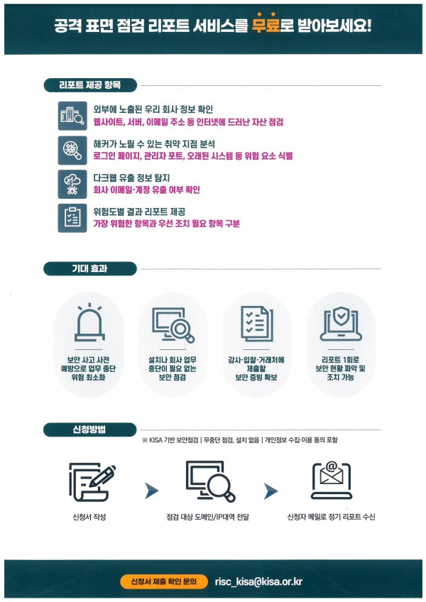 정보보호 취약점 무료 점검 지원 - 인터넷에 연결된 기업자산(IP,도메인,서버,lOT기기 등 해커가 공격을 수행하는데 사용할 수 있는 취약점 및 경로를 탐지 및 위험도 분석하여 기업에 결과 제공