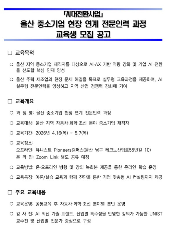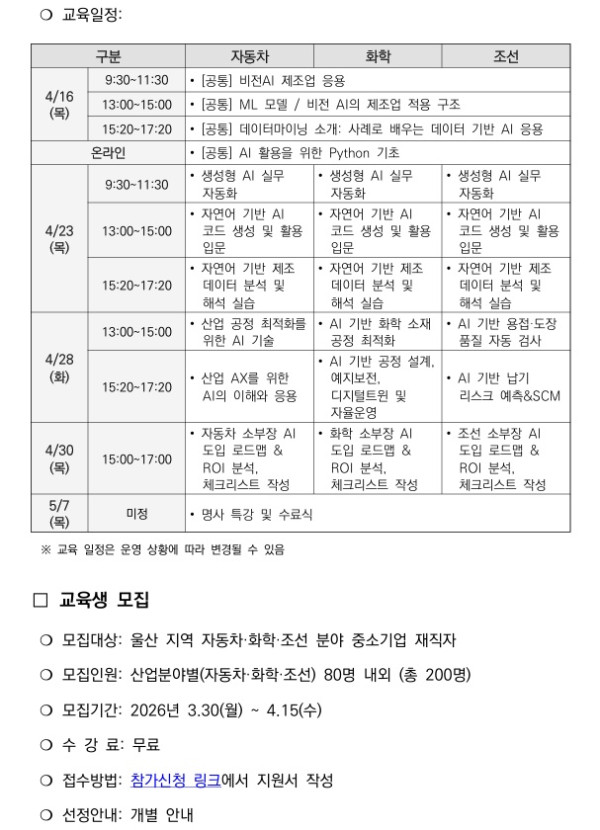 - 모집대상: 울산지역 자동차,화학,조선분야 재직자 - 모집기간: 2026.3.30(월)~4.15(수) - 수강료: 무료 - 선정안내: 개별안내