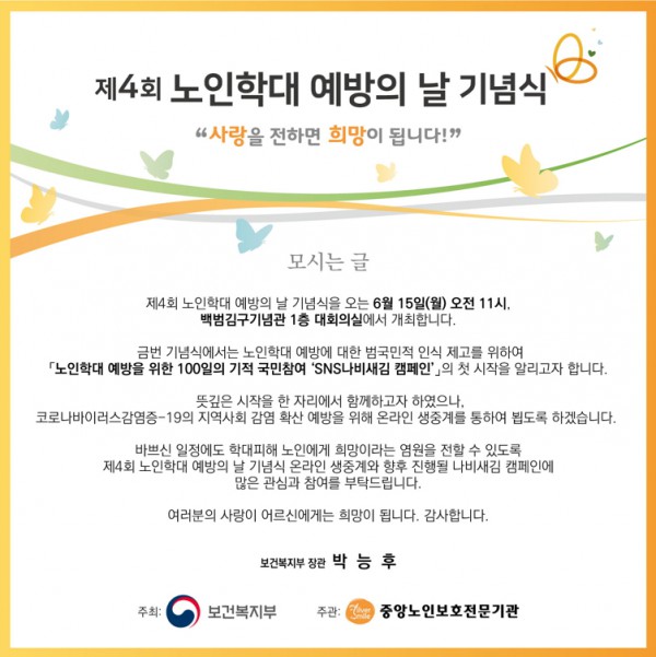 □ 행사명: 제4회 노인학대 예방의 날 □ 주최: 보건복지부 □ 주관: 중앙노인보호전문기관 □ 일시: 2020. 6. 15. (월) 11:00 ~ 11:40 □ 핵심 메시지:‘사랑’을 전하면 ‘희망’이 됩니다. □ 시청방법: 실버아이티비(실버iTV) 유튜브 채널에서 구독 후 생중계 시청 □ 링크 바로가기: https://www.youtube.com/user/silveritv2004
