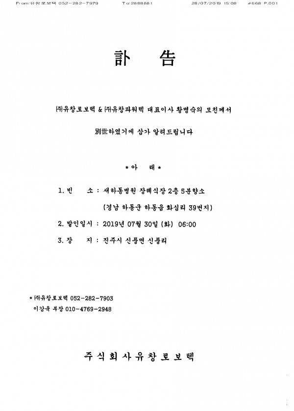 우리 협회 이사이신(주)유창파워텍,(주)유창로보텍 황명숙 대표 모친께서 2019.7.28(일) 별세 하셨음을 삼가 알려드립니다.